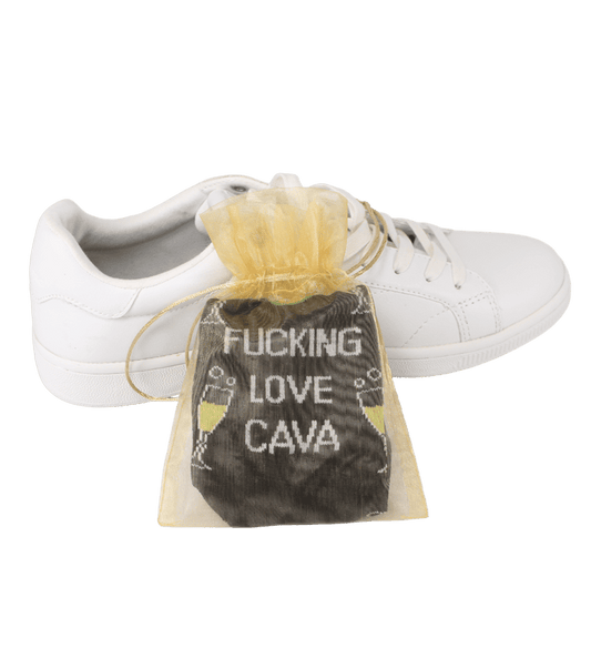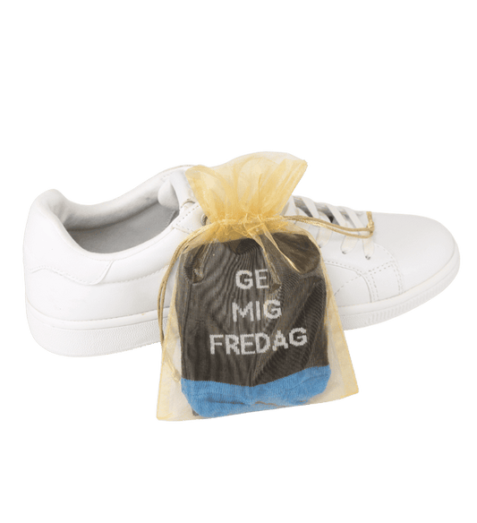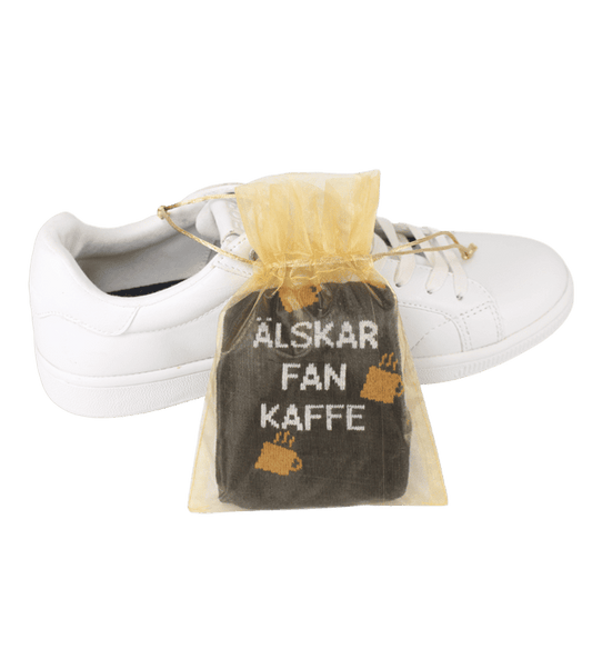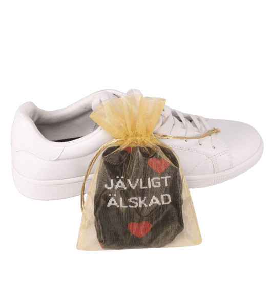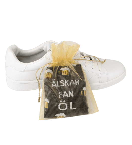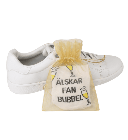 Vinpåse med ett par ankelstrumpor i en guldpåse!
