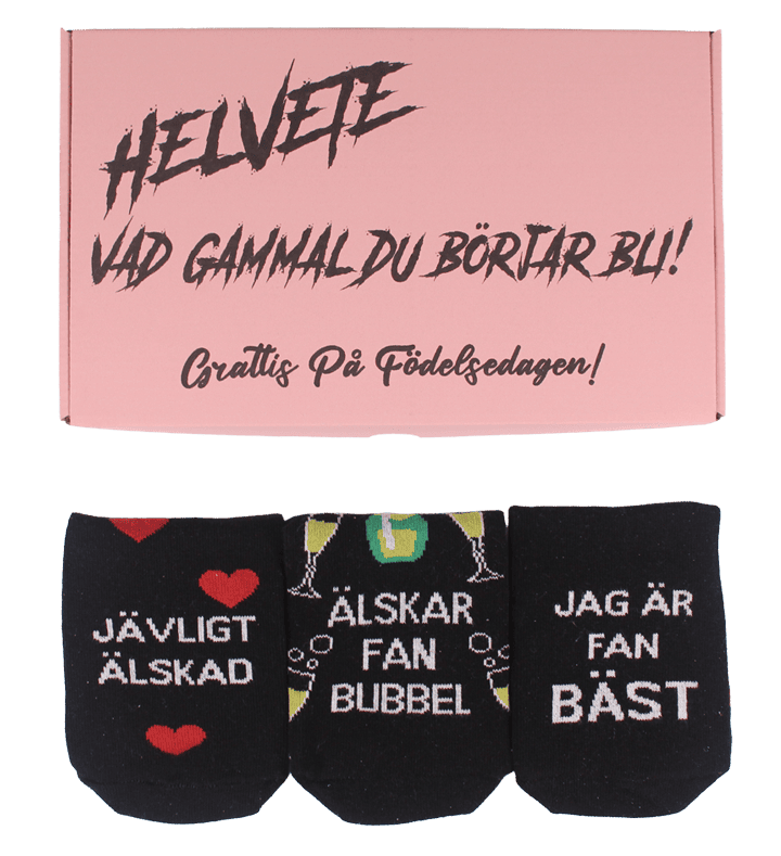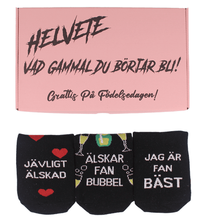 Slip dit indre festdyr løs og lad dine kære sige farvel til midtlivskrisen med vores fantastiske "HVOR GAMMEL BLIR DU" gaveæske! Indeni venter et triumvirat af sokker, der vil holde alle fødder glade.