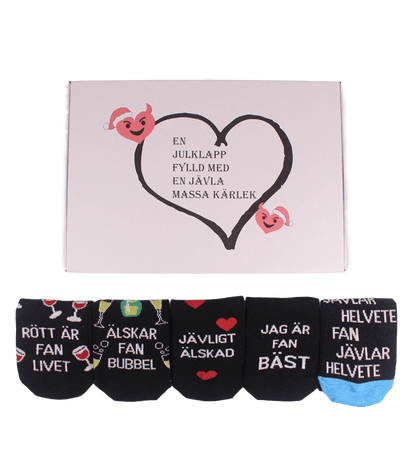 Haluatko antaa joululahjan, joka ei vain levitä lämpöä, vaan myös reilun annoksen asennetta? Sitten olet tullut oikeaan paikkaan! Meidän Joululahja täynnä rakkautta sisältää viisi paria sukkia, joissa yhdistyvät huumori, kiroilu ja rakkaus – kaikki toimitetaan tyylikkäässä joululaatikossa, joka saa vastaanottajan taatusti nauramaan ääneen!