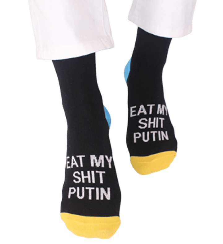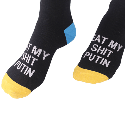 Laadukkaat vihaiset sukat viestillä SÖÖ MINUN PASKANI PUTIN.