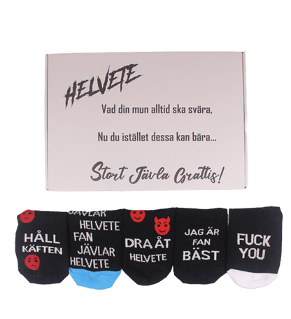 Tiedätkö jonkun syntymäpäivää juhlivan, jonka sanavarasto ei riitä ilmaisemaan tunteitaan? Älä huoli, meillä on sinulle täydellinen lahjaratkaisu – "Swear Socks" -lahjalaatikkomme! Tyylikkään valkoisen laatikon sisältä löydät viisi paria sukkia, joista jokaisessa on voimakas viesti, joka kertoo kaiken, mitä vastaanottaja saattaa haluta huutaa ääneen.